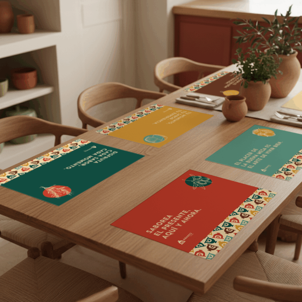 La paleta cromática, dominada por el rojo cálido y los tonos tierra, se complementa con verdes y naranjas que aportan vitalidad y equilibrio. Este conjunto transmite naturalidad, pasión y respeto por el producto local.